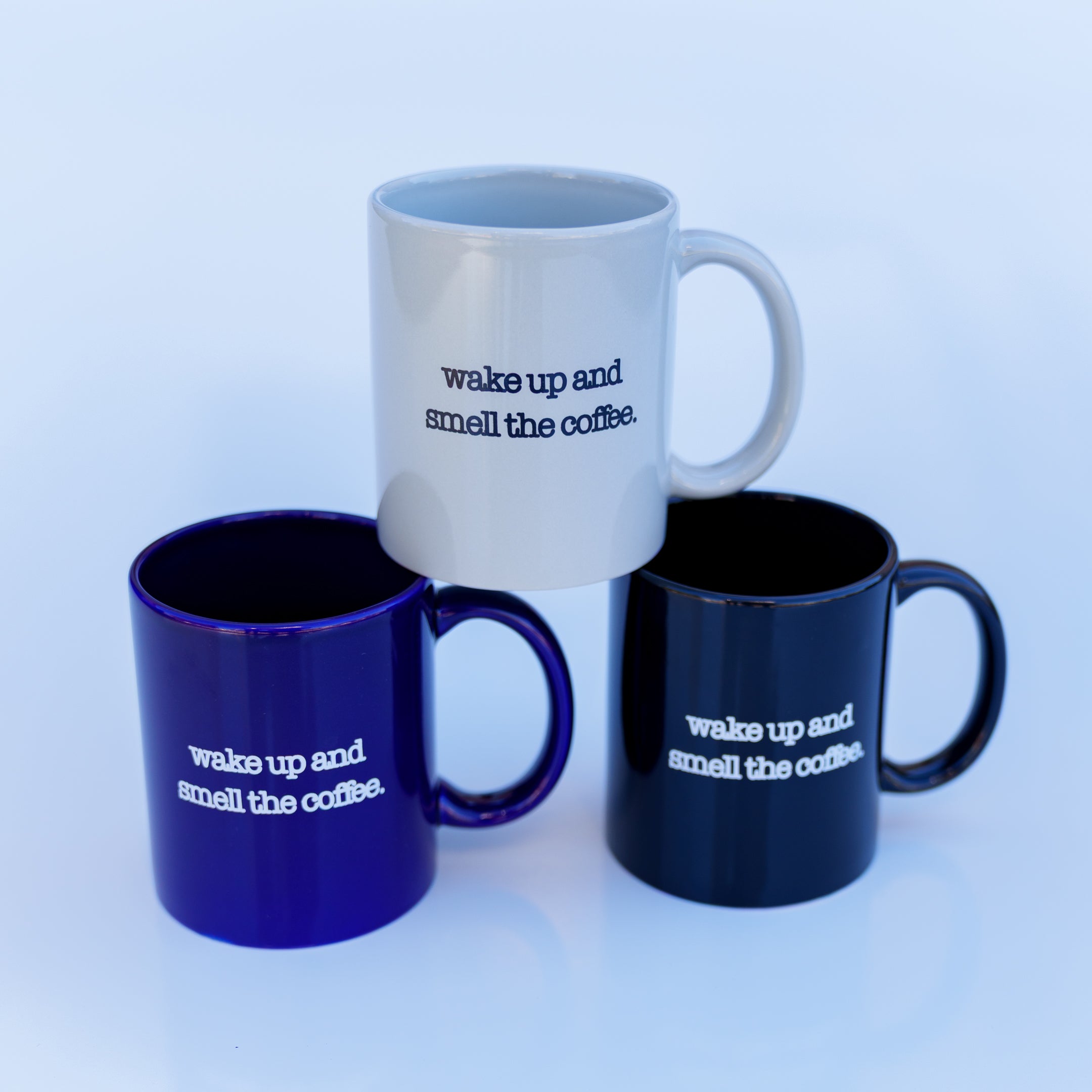A ceramic coffee mug with a traditional loop handle, and our signature coffee mug quote, "Wake Up and Smell the Coffee". Opposing side printed with our avenir logo.