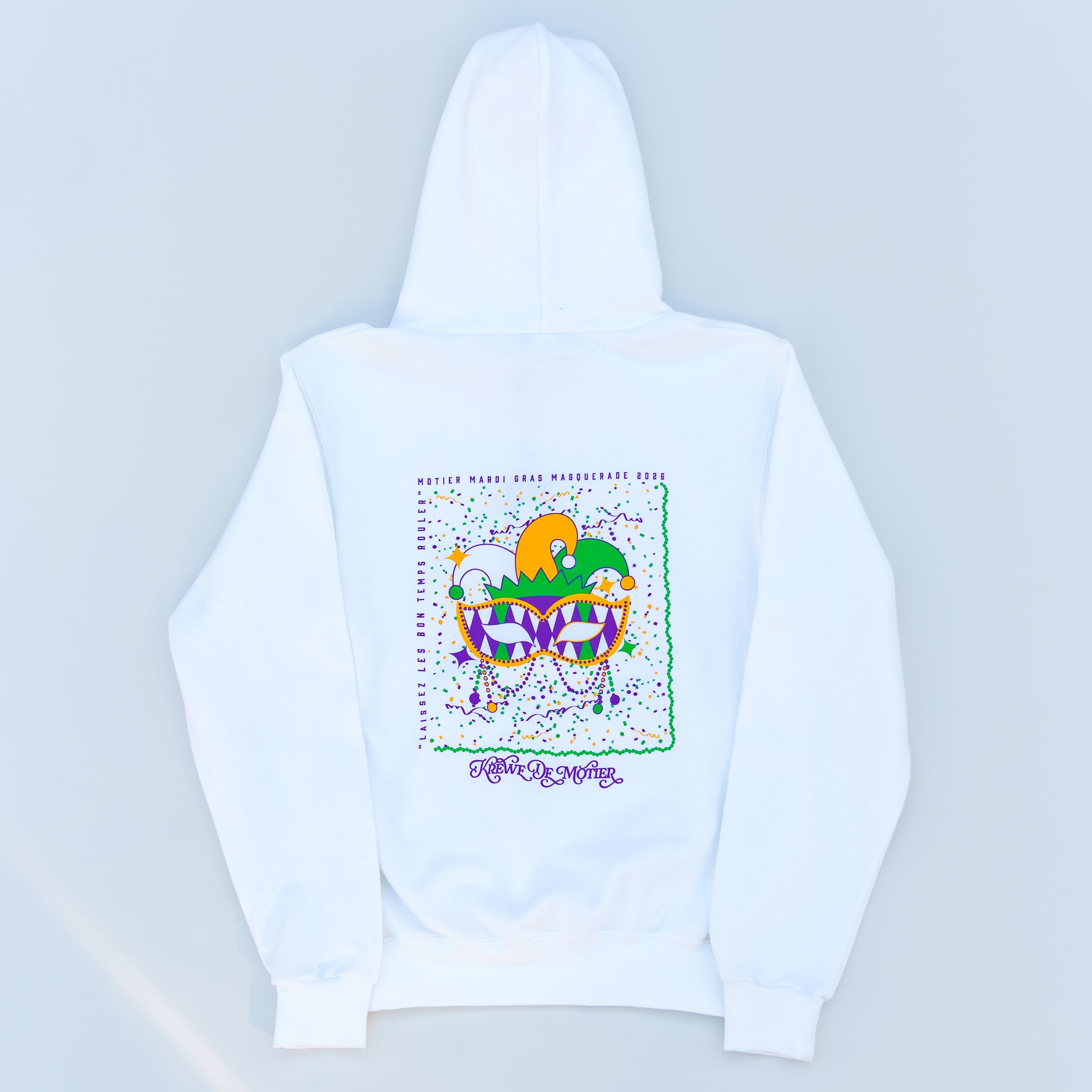 The Masquerade Design. A new chapter in the 2026 Krewe De Motier graphics. Inspired by the madness and magic of Mardi Gras. A bold mask graphic surrounded by cascading beads.