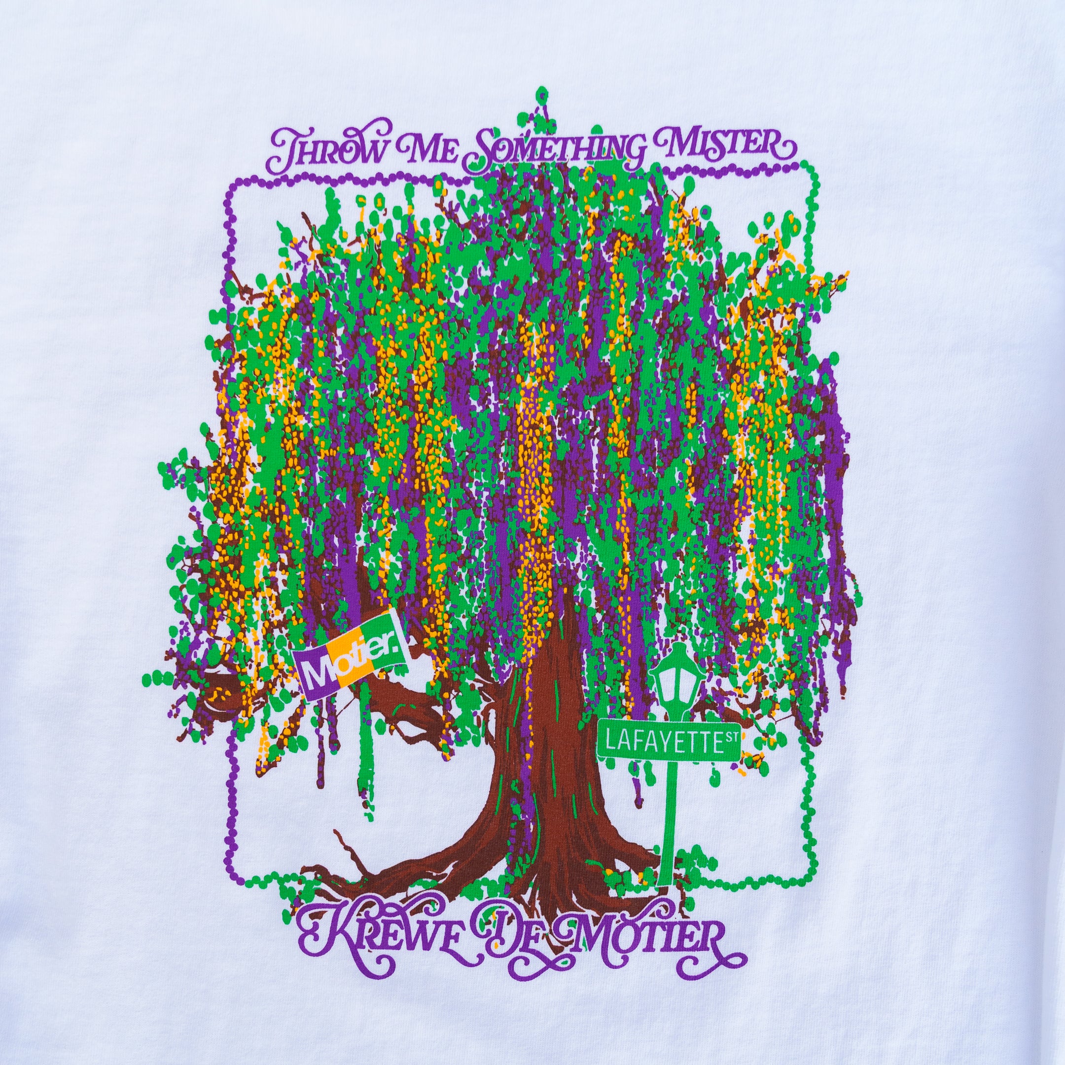 One of three Krewe De Motier graphics for 2026. The Parade Tee. Pulled from the heart of Lafayette Mardi Gras. A raw replication of the oak tree layered in beads every season.