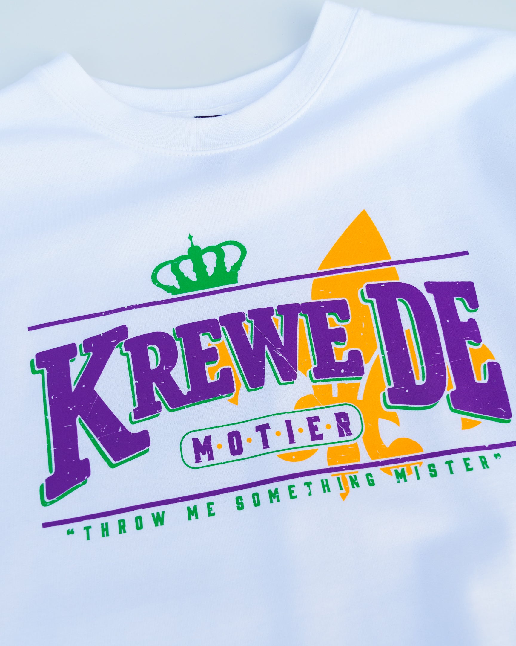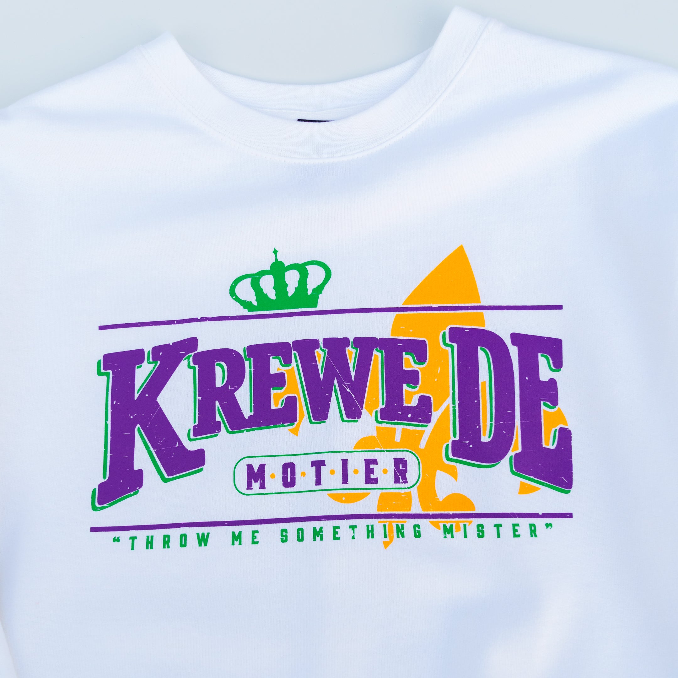 A new take on the Krewe De Motier collection. An oversized, vintage-distressed front graphic. A bolder evolution of the Krewe De Motier vibe.