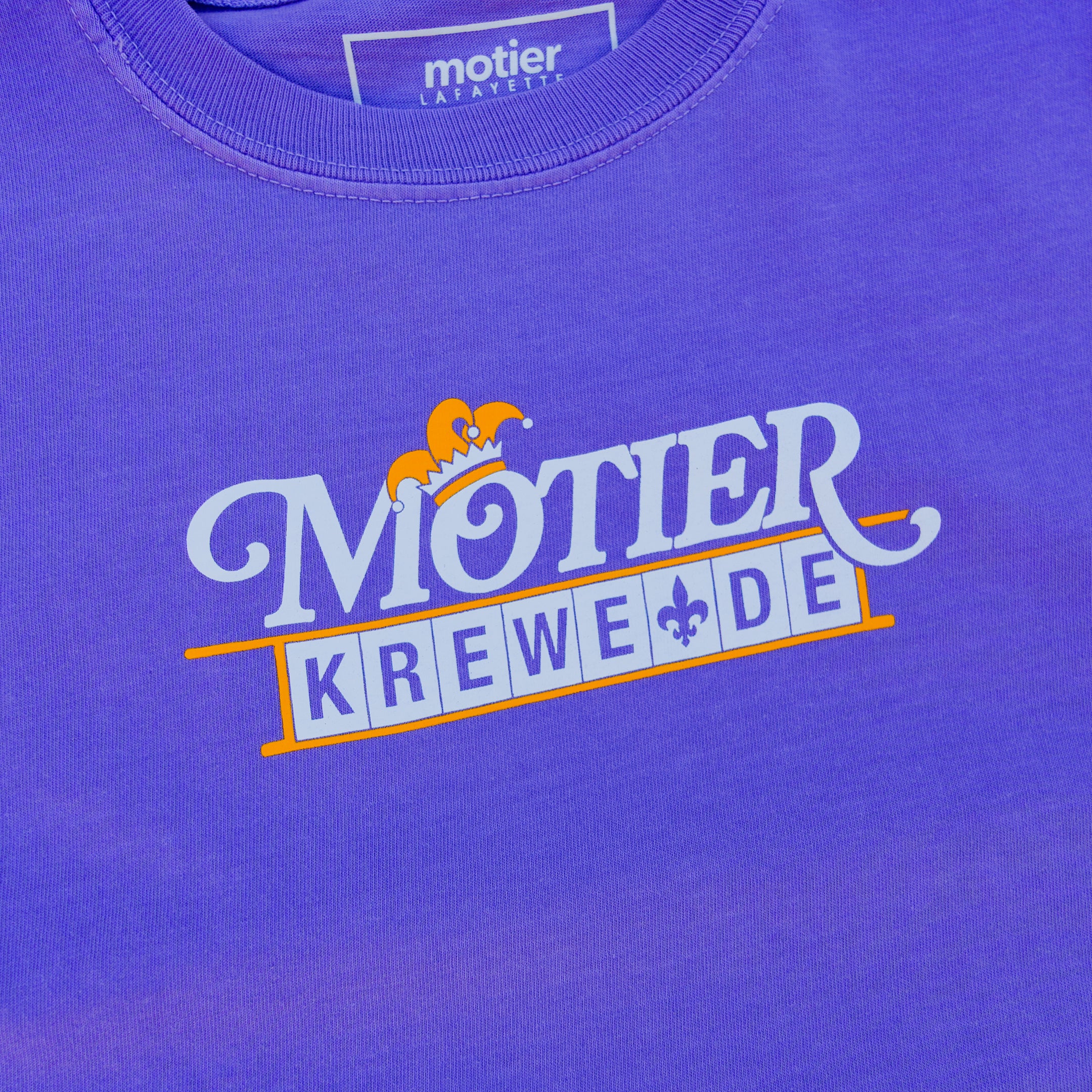 The Masquerade Design. A new chapter in the 2026 Krewe De Motier graphics. Inspired by the madness and magic of Mardi Gras. A bold mask graphic surrounded by cascading beads.